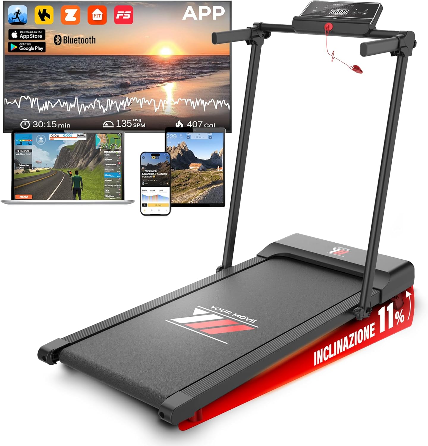 Scopri YM Tapis Roulant NEXT 1000 Your Move: allenati fino a 12 km/h con maxi superficie da 42 cm, inclinazione e design salvaspazio pieghevole con assistenza italiana